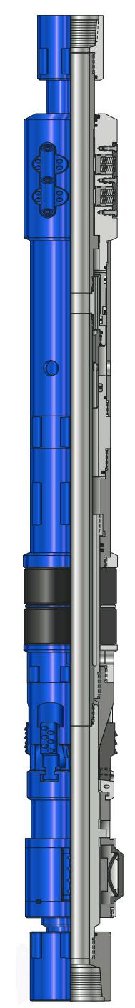 该封隔器是一种具有同轴旁通的悬挂式可回收封隔器。当工具进入井中时J型槽保持旁通打开,同时控制封隔器座封,当封隔器座封后,油管压力驱动驱动平衡活塞,保持旁通关闭。